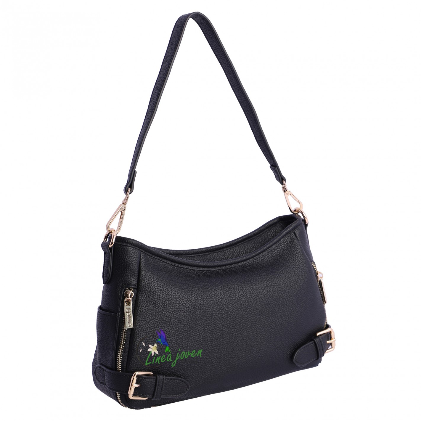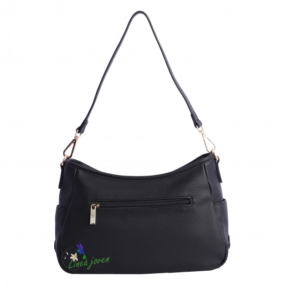 Bolso negro piel sintética, para hombro, incluye asa bandolera ajustable y extraible. 32 x 9 x 18 cm