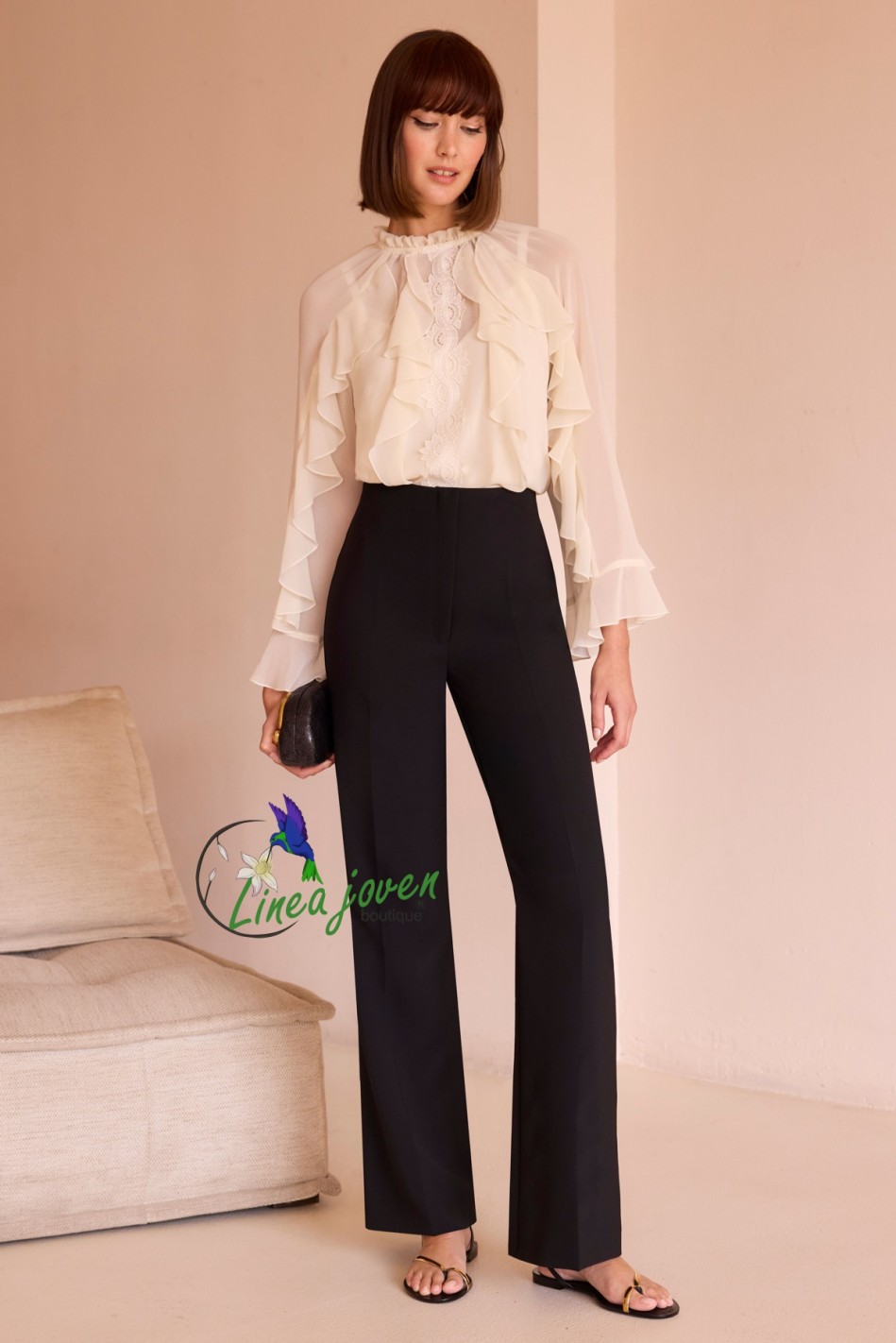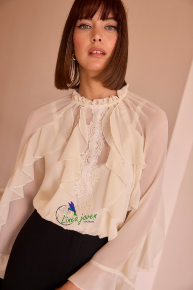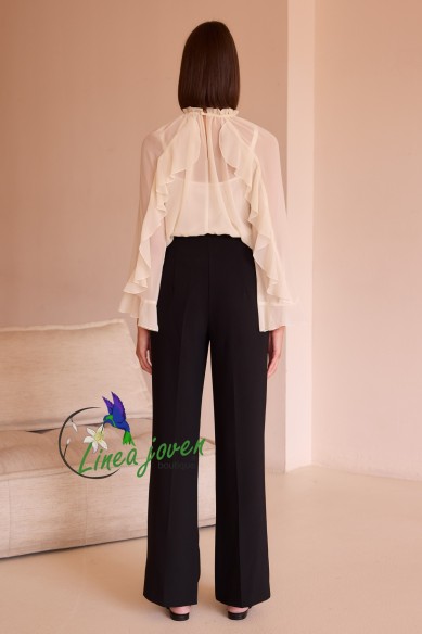Conjunto de fiesta bicolor blanco negro romántico cuello perkins con volantes y manga poeta