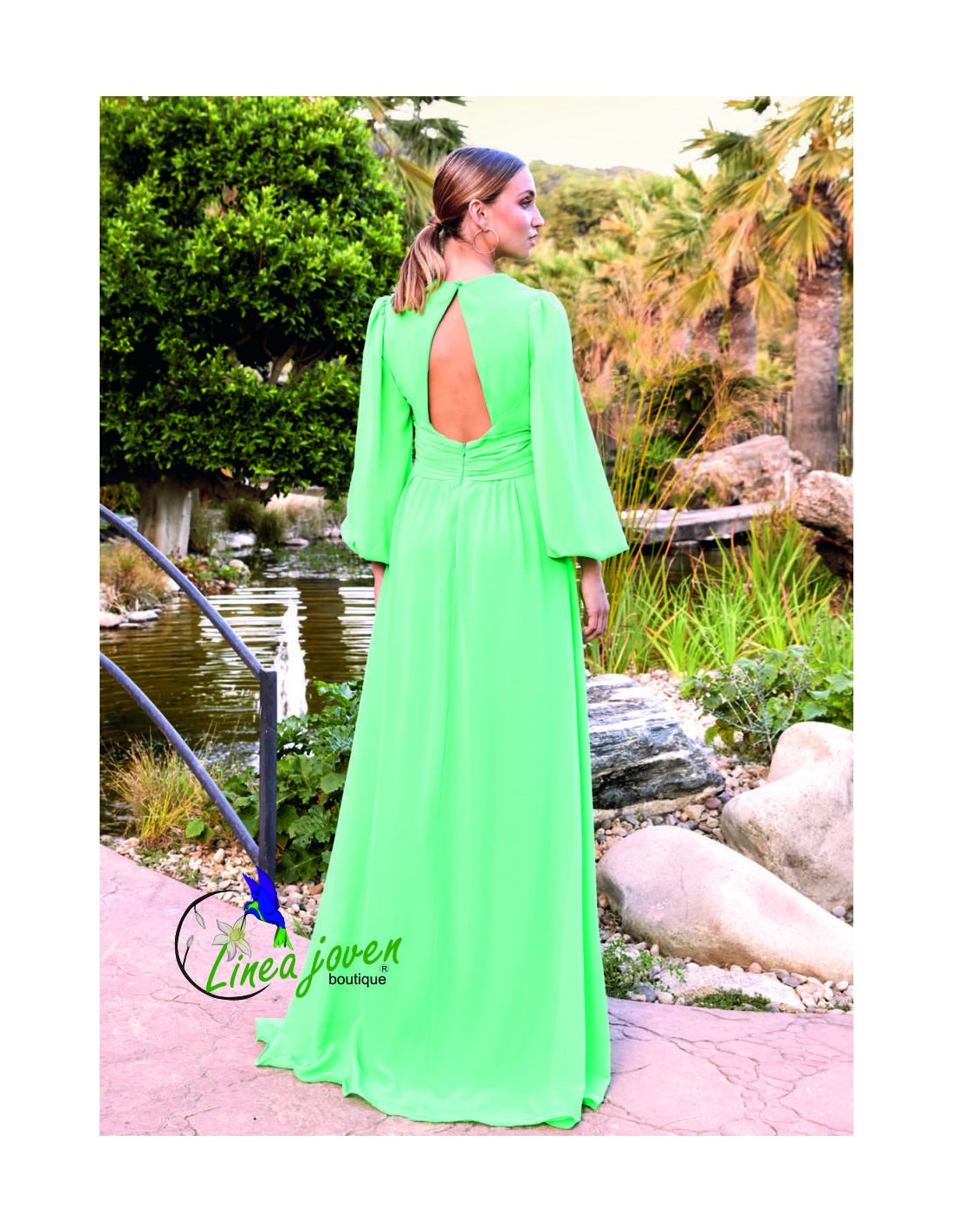 Vestido largo confeccionado en gasa, manga ablusada y bonita espalda abierta. Tallas 36 a 46