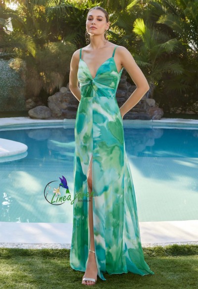 Vestido de fiesta largo largo estampado turquesas con semicapa, escote cruzado drapeado, con tirantes, abertura frontal en falda volada tul