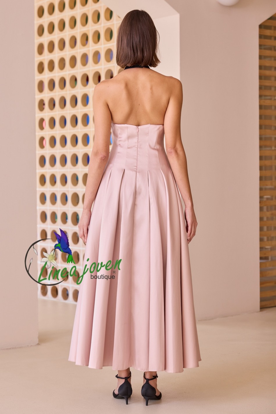 Vestido de fiesta bicolor negro rosa escote halter falda volada larga con detalle floral negro