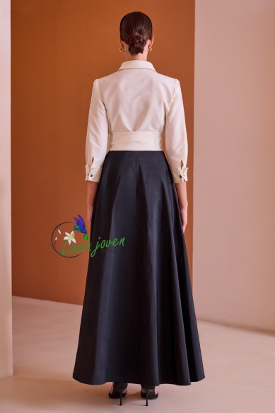 Vestido de fiesta bicolor blanco negro con lazo escote cruzado falda volada