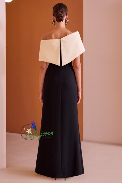 Vestido de fiesta asimétrico bicolor negro crema, escote of the shoulder y falda con abertura a panel plisado estilo soleil