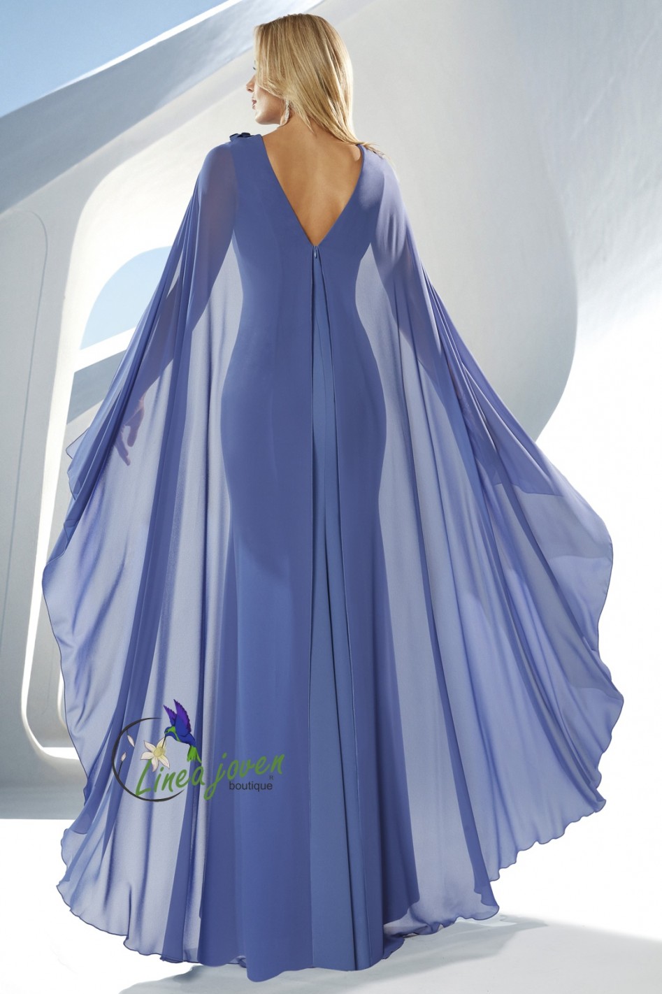 Vestido de fiesta largo azul escote barco floral capa gasa volada