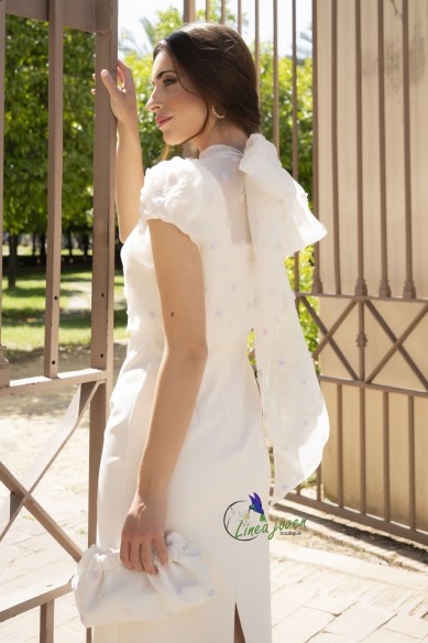 Vestido de fiesta blanco entubado rebeca tul topitos