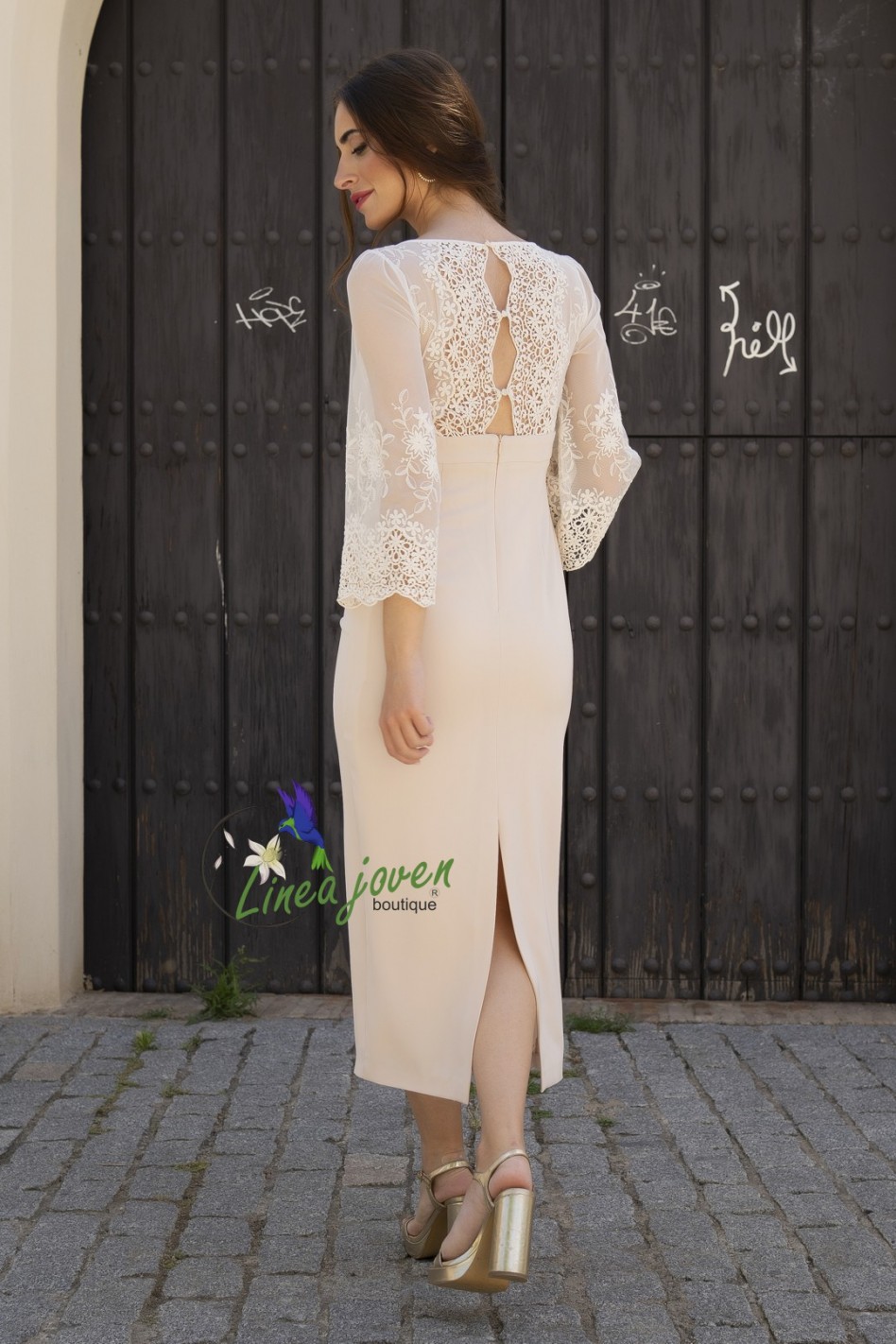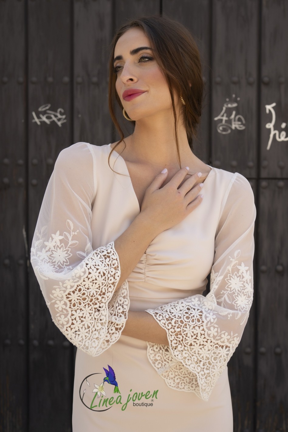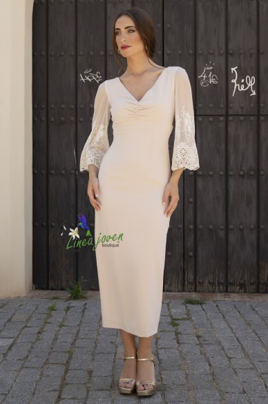 Vestido de fiesta beige mangas tul encaje escote V fruncido
