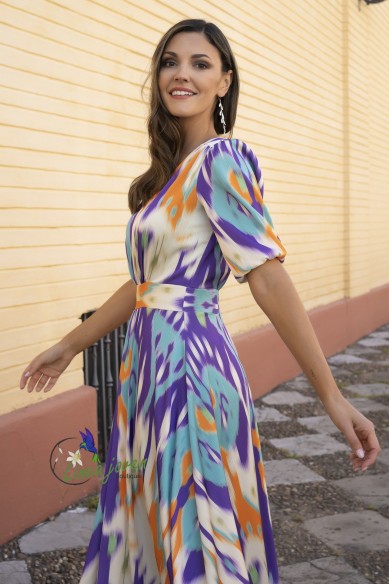 Vestido de fiesta ikat boho falda volada manga abullonada escote v