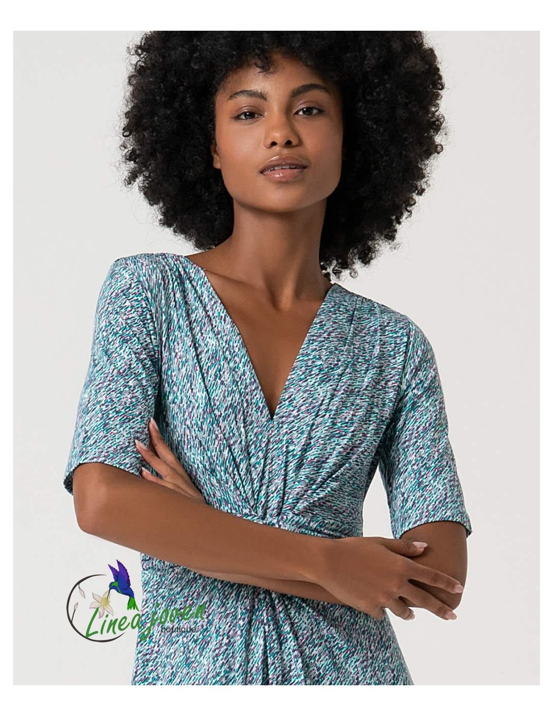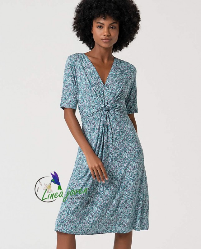 Vestido largo rodilla con manga francesa y detalle de nudo en la cintura. Fabricado en aloe vera, suave y elástica.